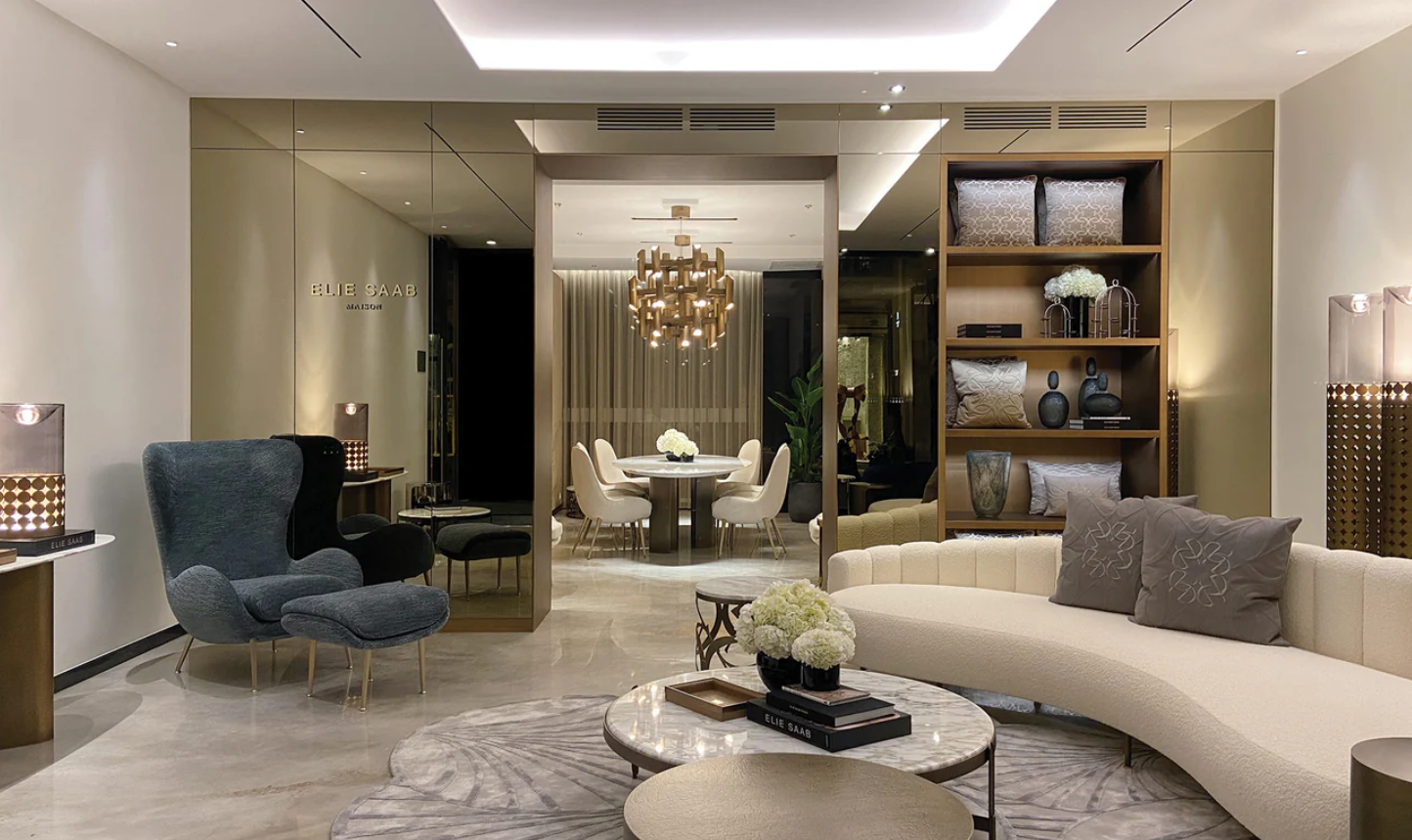 ELIE SAAB Maison embraces a contemporary architectural design, blending statement lighting, sculpted tables, and luxurious curved sofas to create a bold, sophisticated atmosphere.